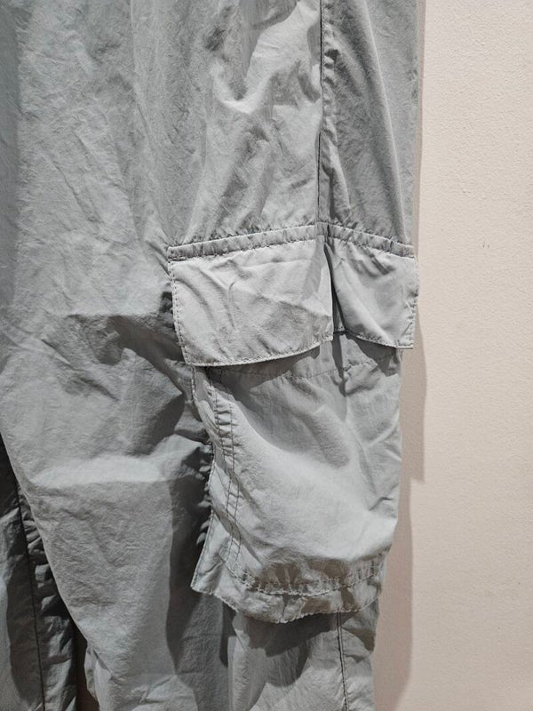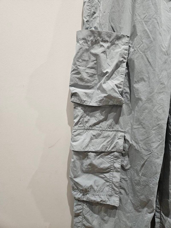 Pantalón azul cielo tipo chándal ancho como nuevo. Lleva bolsillos laterales y cuerda para estrechar la parte inferior. Es la talla S, de la marca Pull&Bear. De cintura sin estirar mide 35cm y estirado 49cm. De largo mide 103cm y de tiro 32cm. Composición 100% poliamida.