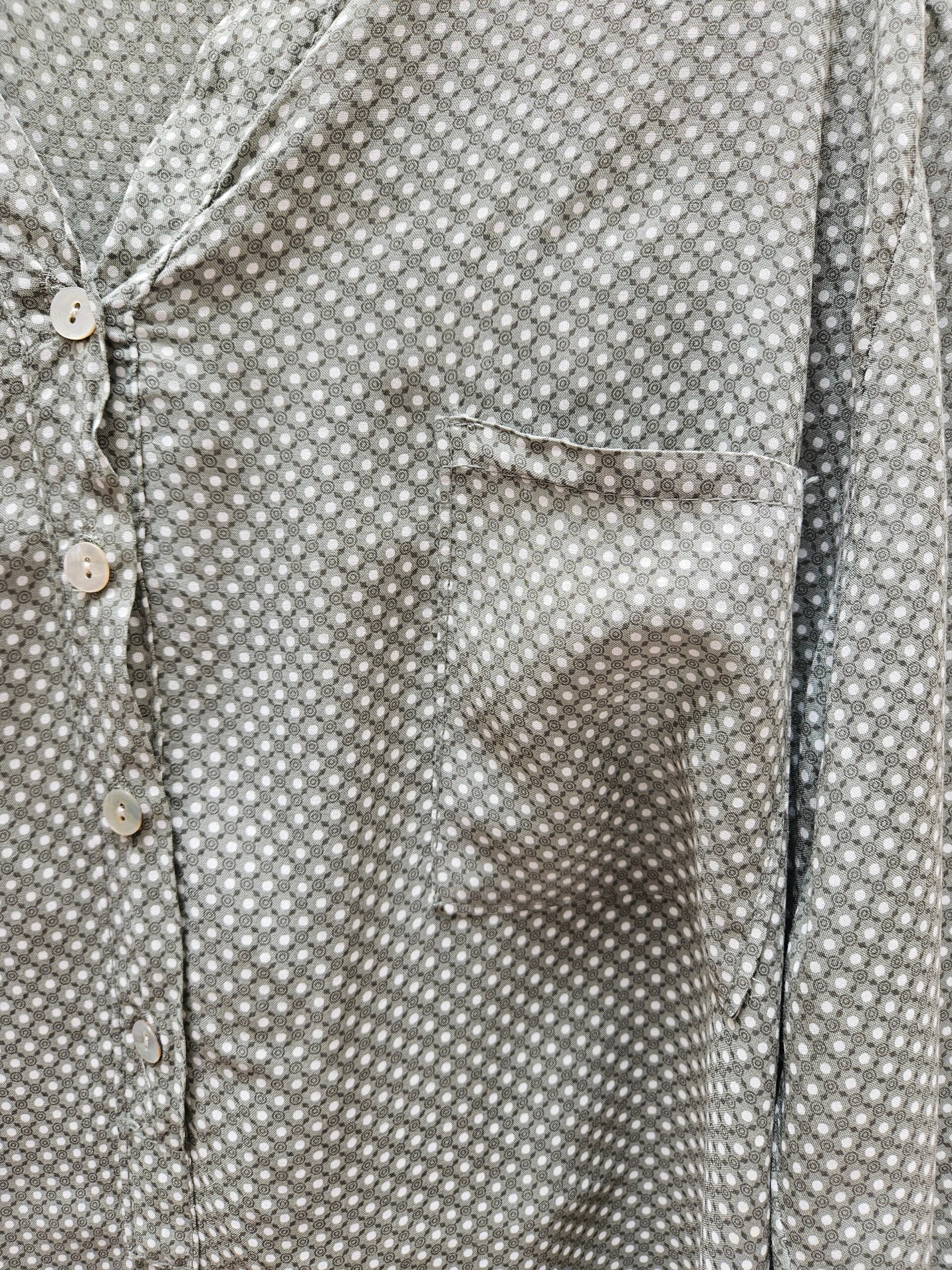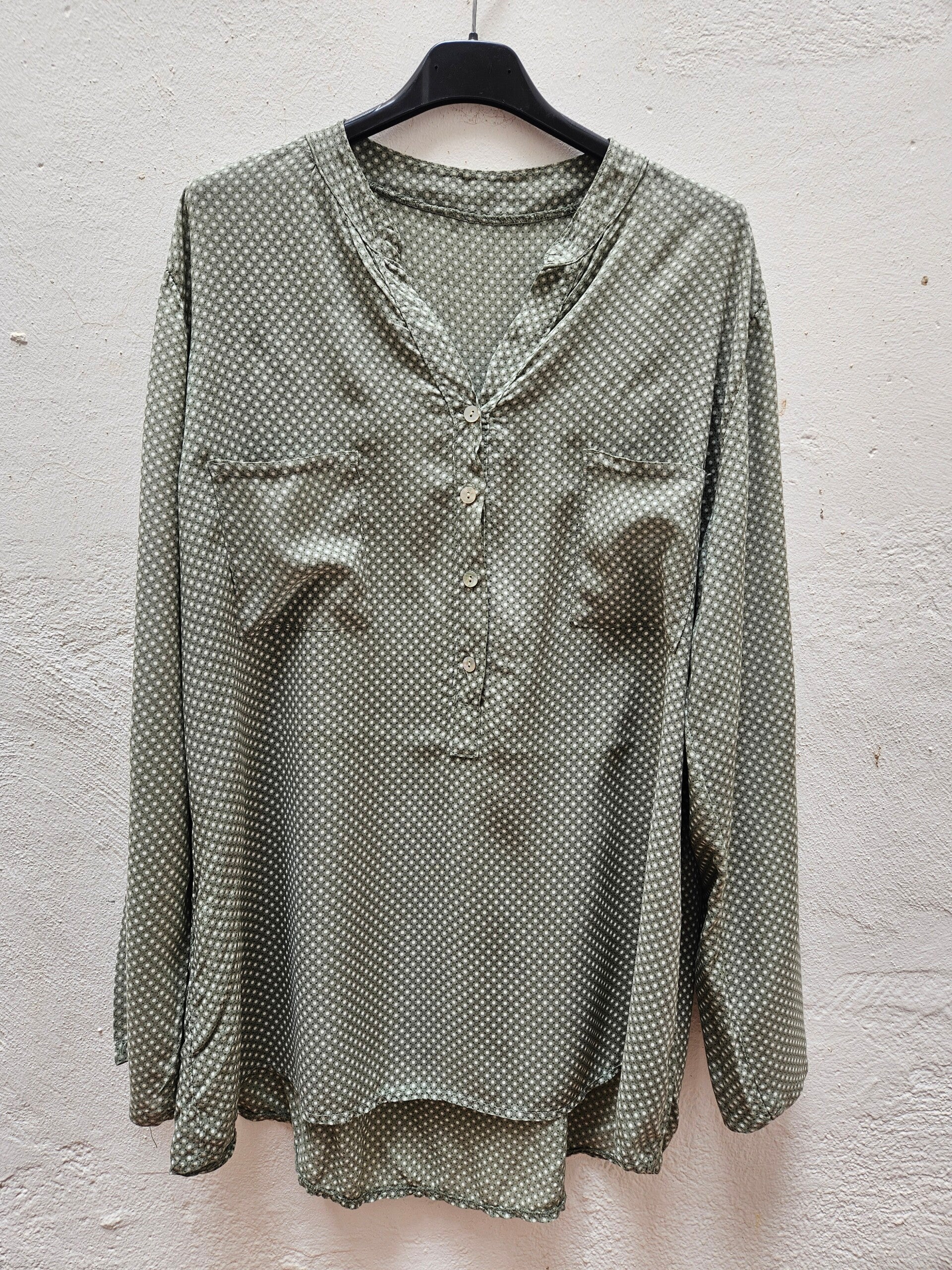 Blusa como nueva verde con detalles blancos. Las mangas se pueden hacer cortas. Es talla L/XL, queda holgada. De axila a axila mide 61cm, de hombros 47cm y de largo 77cm. Composicion: 100% viscosa.