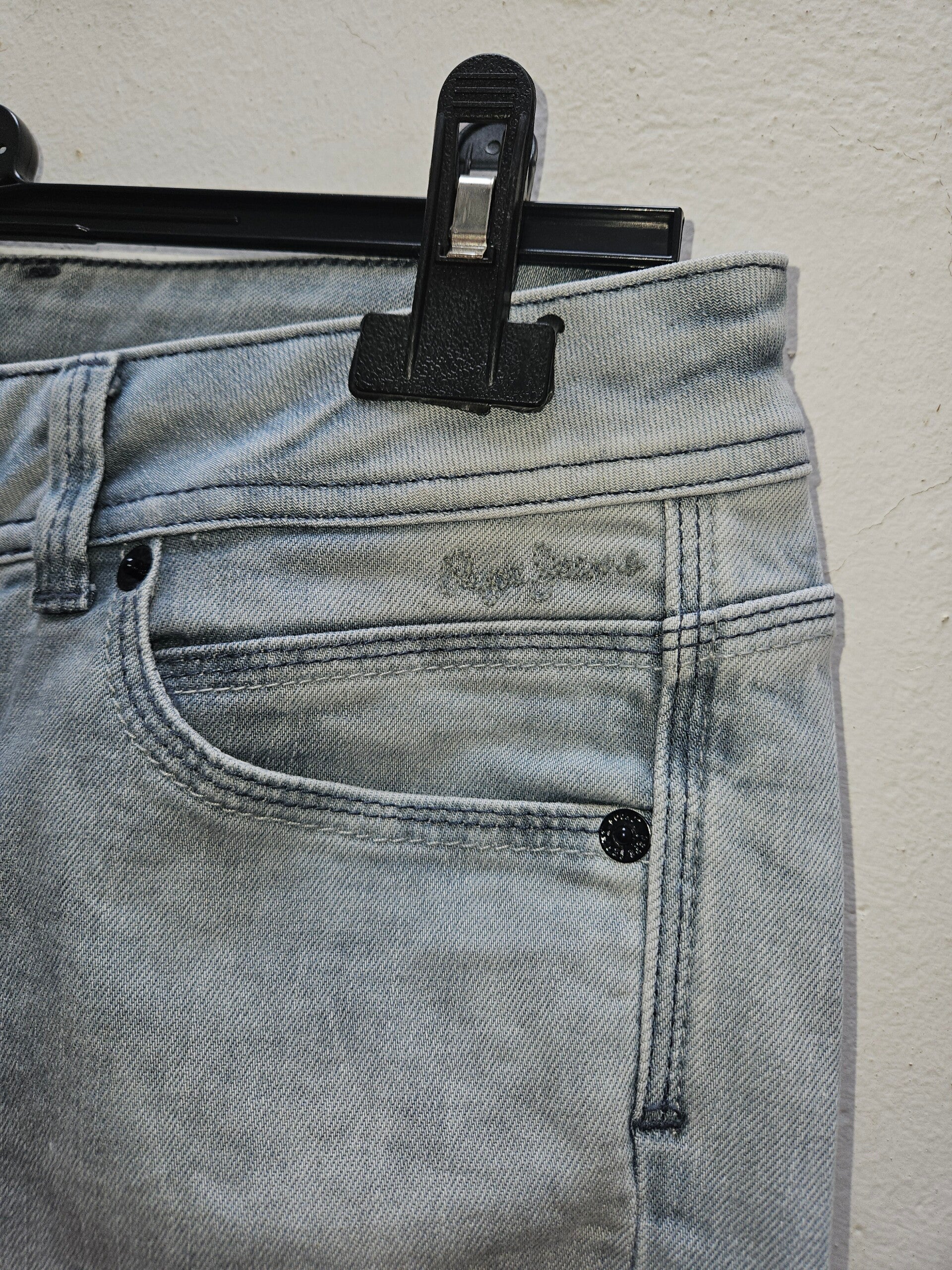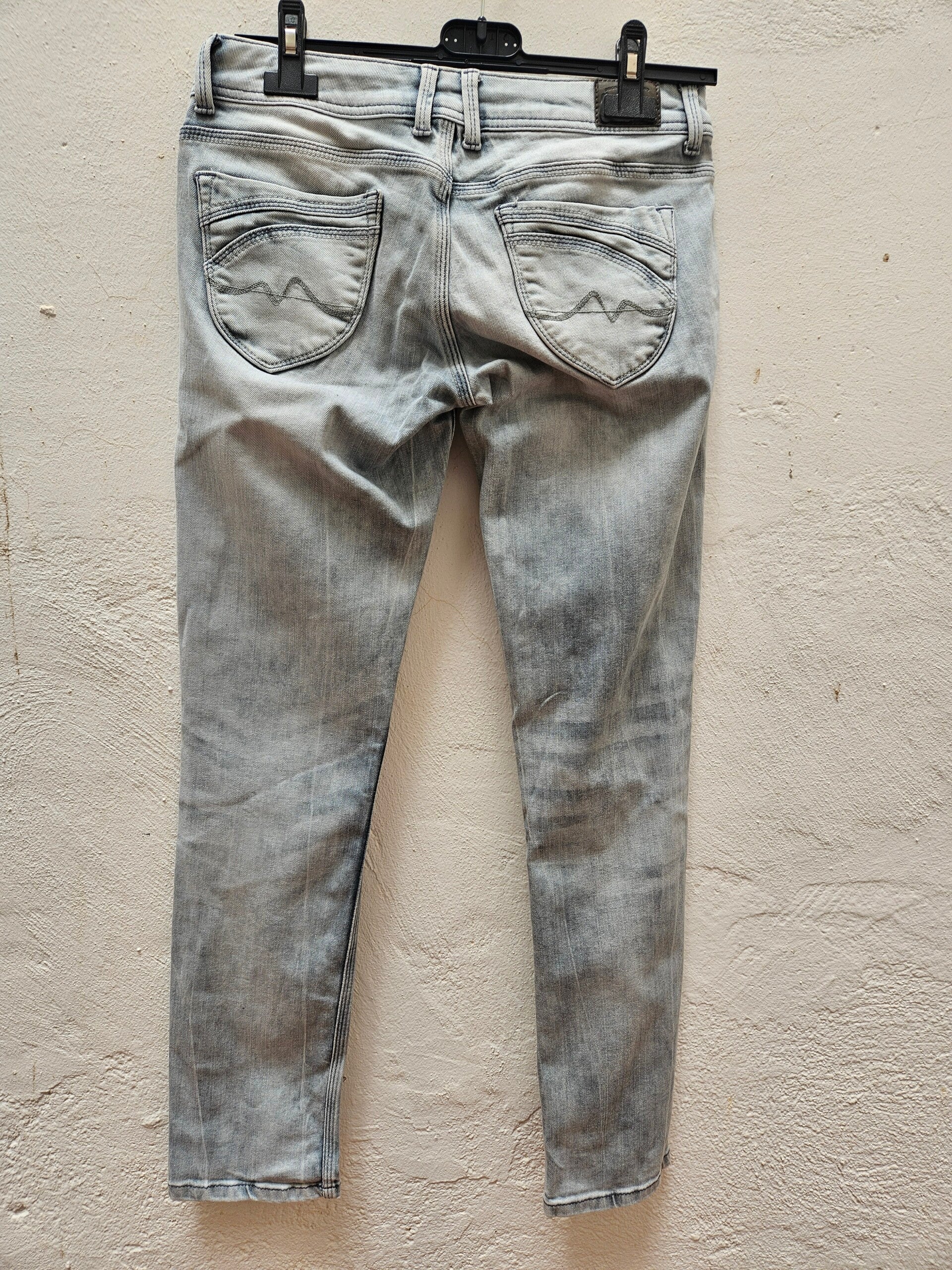 Pantalón tejano / vaquero como nuevo de tiro bajo y pitillo. En color azul claro. Es la talla 28, como una 38. De la marca Pepe Jeans. De cintura mide 36cm, de tiro 18cm y largo total 95cm. Composicion: 99% de algodón y 1% de elastano