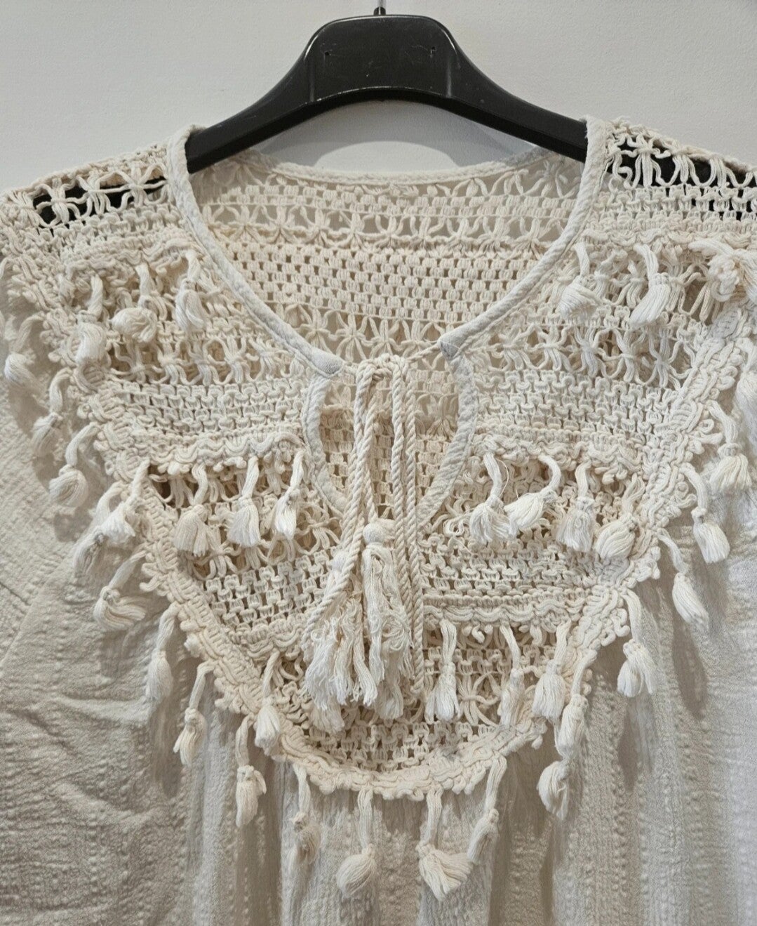 Camiseta blanca tipo ibicenca como nueva. Con ganchillo en la zona de escote y espalda. Mangas 3/4 con elastico final. Es la talla M, de la marca Dodo Fashion. De axila a axila mide 48cm y de largo 56cm. Composición: 100% algodón.