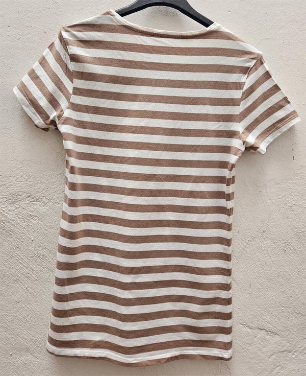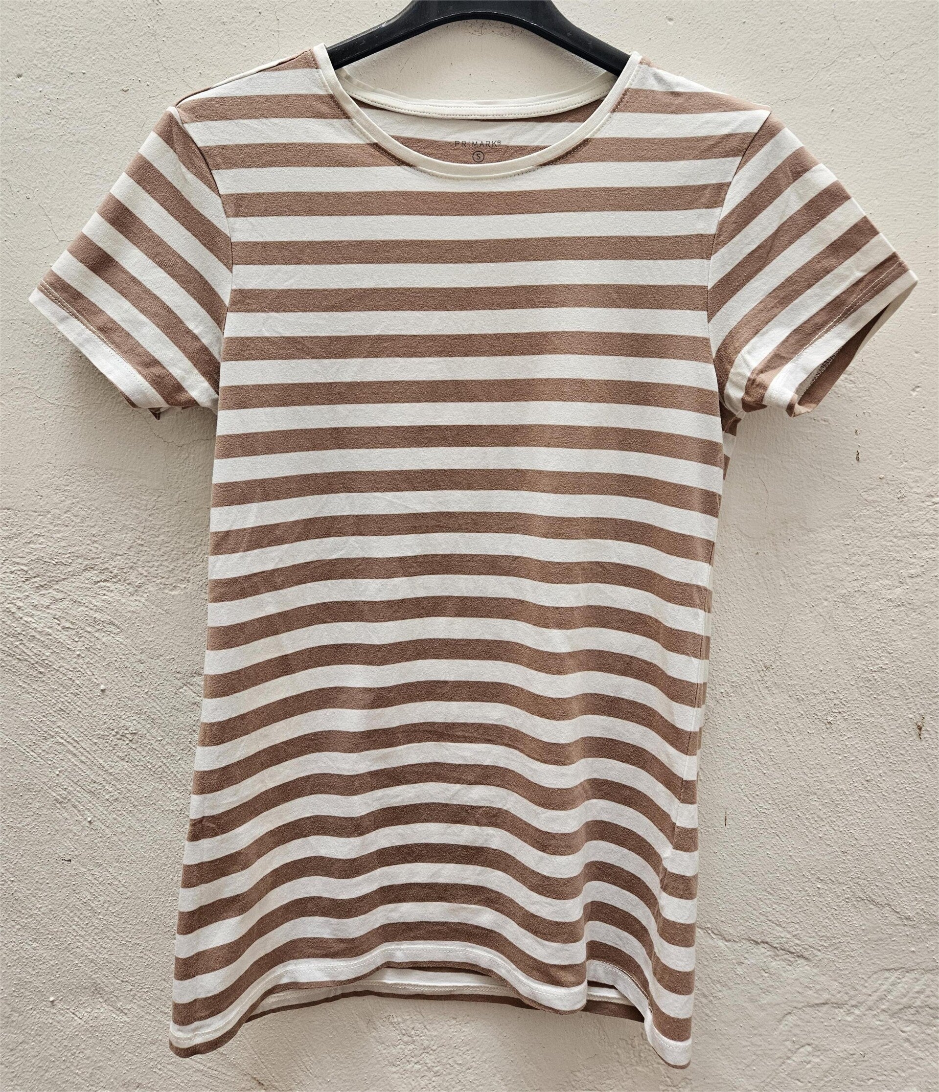 Camiseta de manga corta con rayas marrones y blancas como nueva. Es la talla S, de la marca Primark. De axila a axila mide 41cm, de hombros 35cm y de largo 65cm.