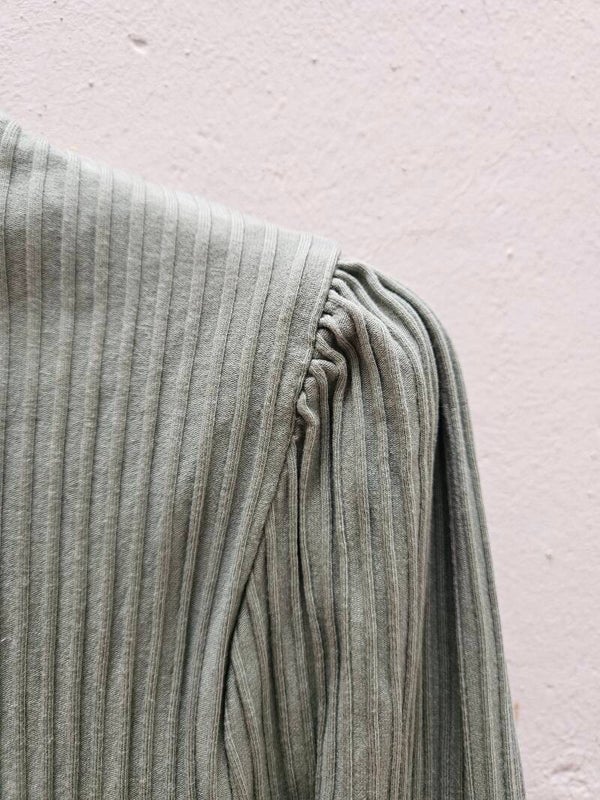 Camiseta verde como nueva tipo canale. Tiene detalles en los hombros. Es la talla L, de la marca Stradivarius. Queda ajustada. De axila a axila mide 39cm, de hombros 32cm y de largo 58cm.