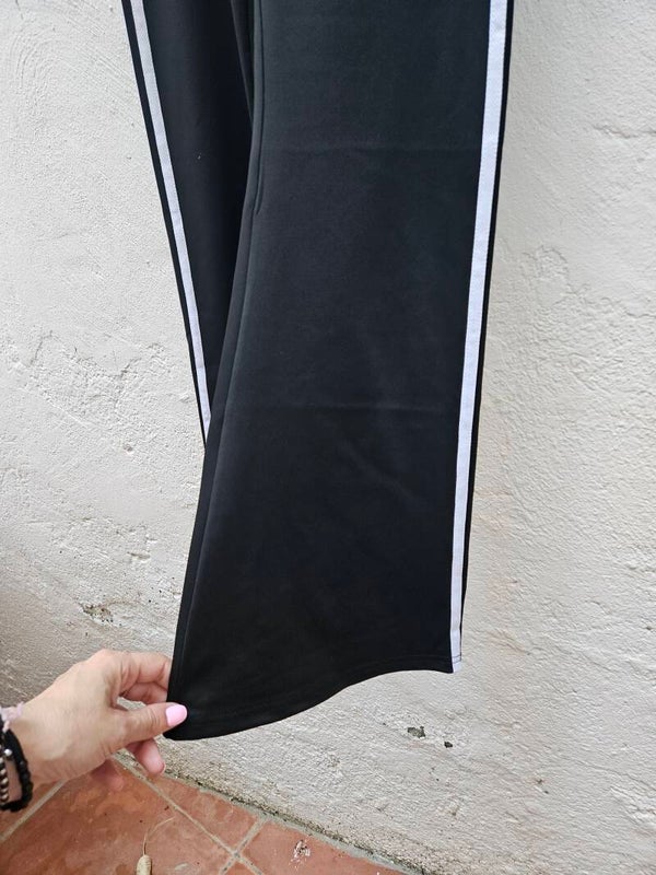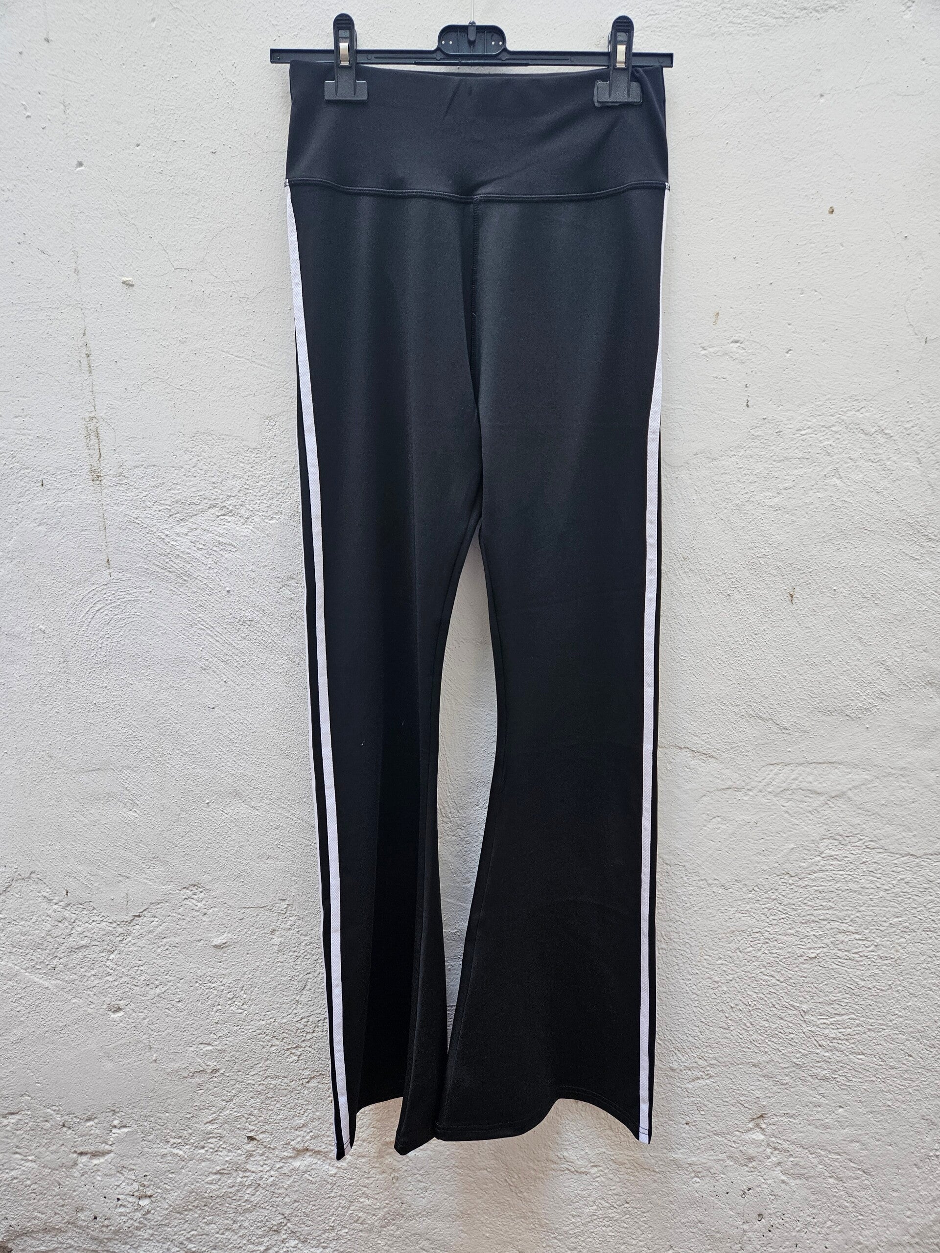 Leggings negro de campana con franja lateral blanca. Son nuevos a estrenar. Son la talla M, de la marca Shein. De cintura sin estirar mide 33cm y estirado 45cm. De tiro mide 30cm y largo total 105cm. Composicion: 92% poliester y 8% elastano.