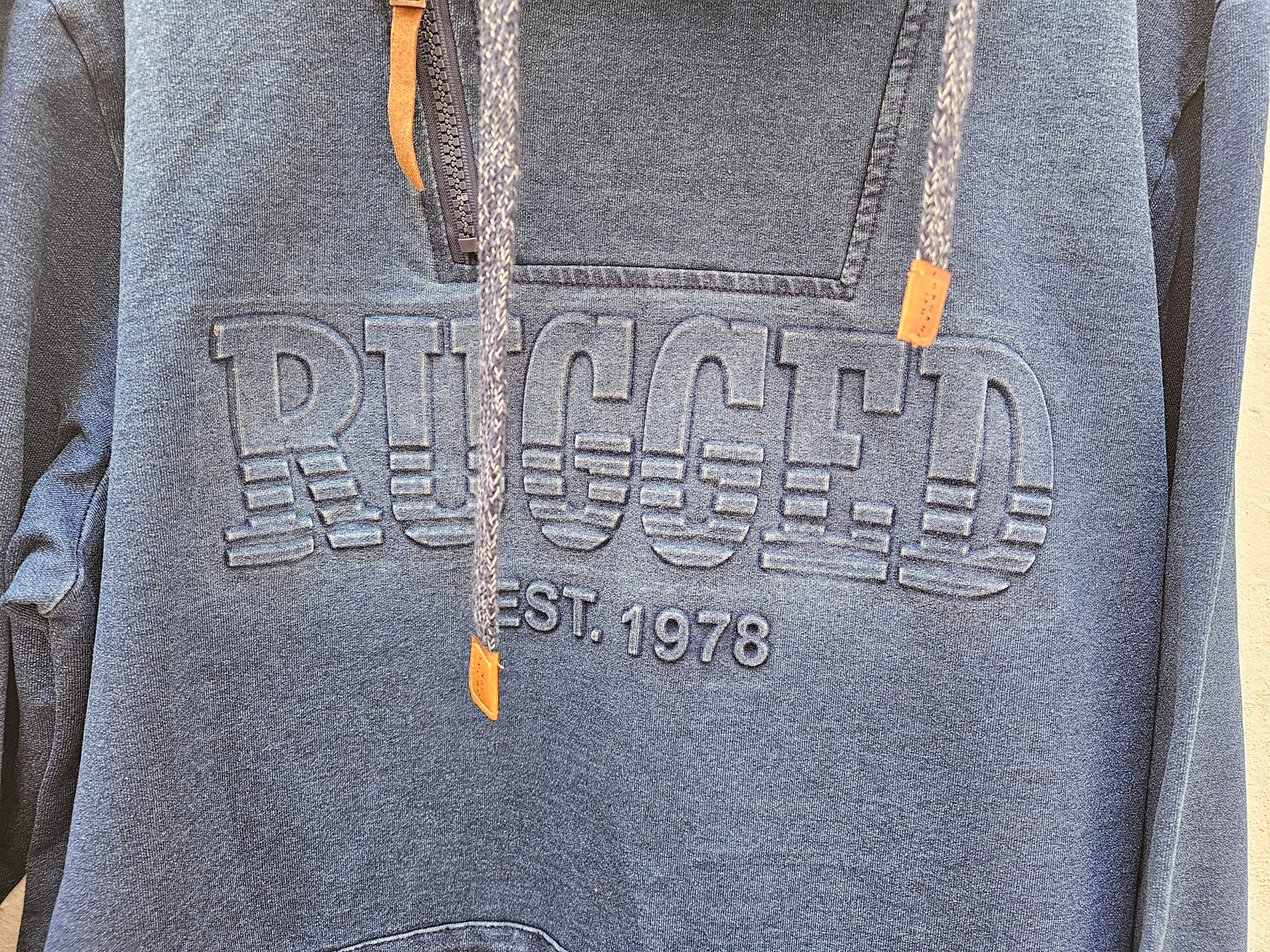 Sudadera azul de hombre como nueva. Con bolsillo central y letras en relieve. Es la talla L, de la marca Koröshi. De axila a axila mide 58cm, de hombros 46cm y de largo 72cm. Composición: Algodón y poliester.