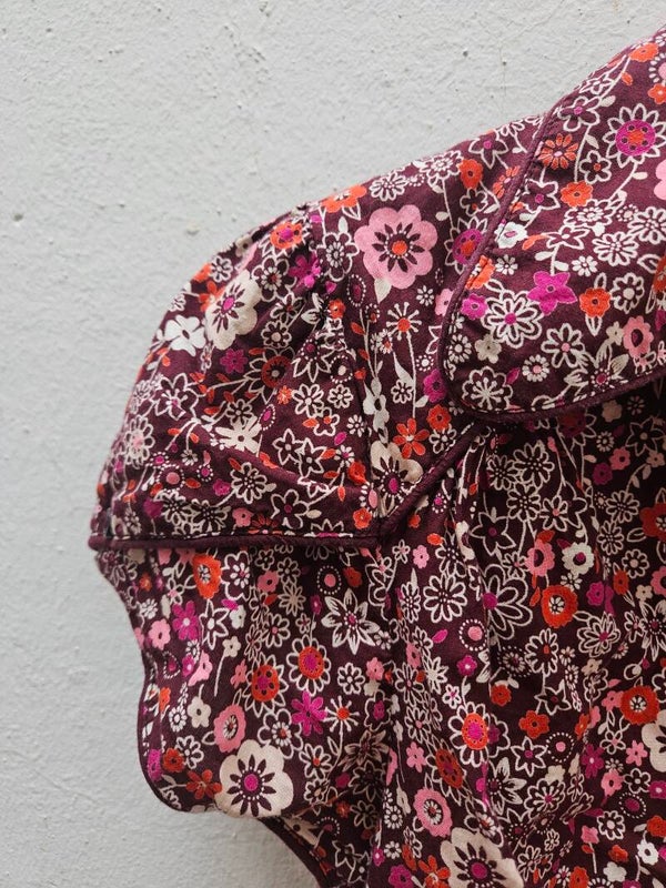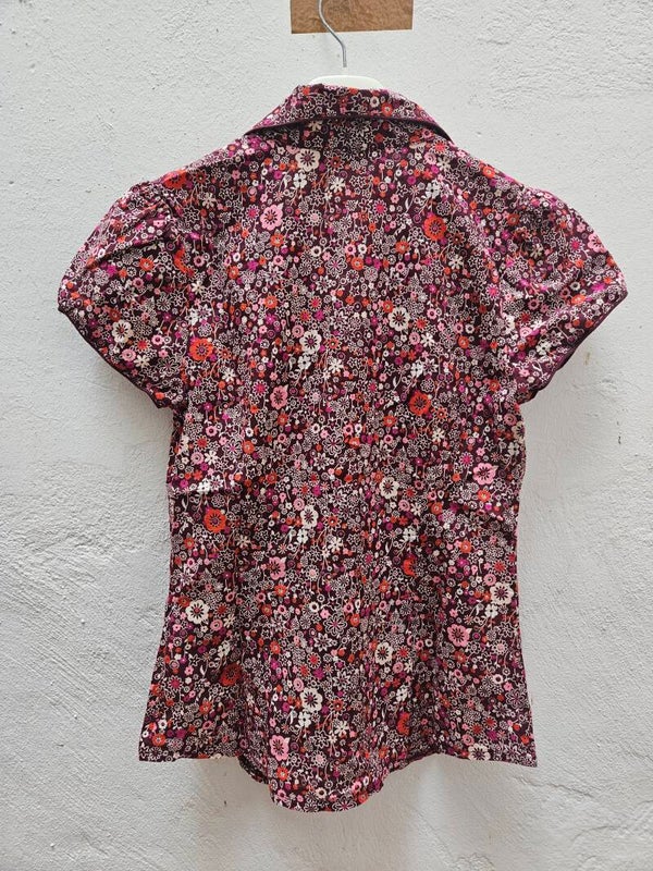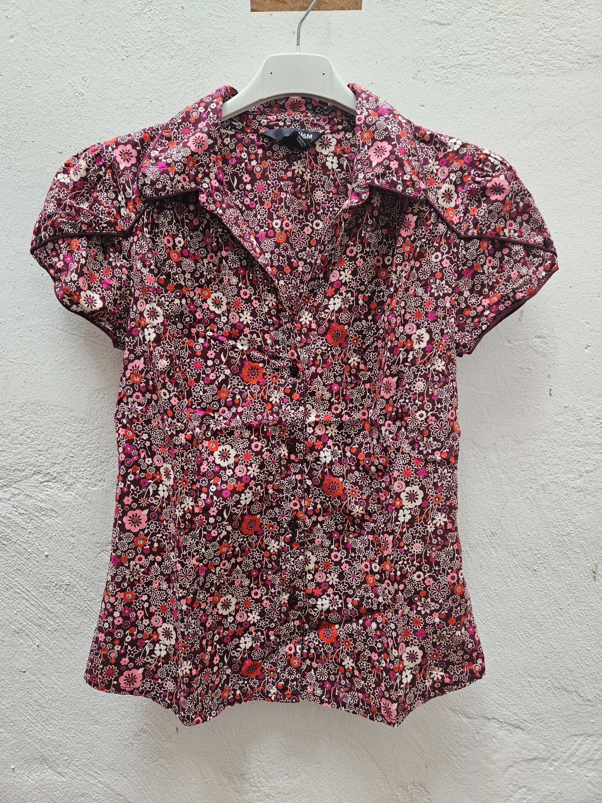 Camisa de manga corta como nueva burdeos con flores. Con cuello pico. Es la talla 34, de la marca H&M. De axila a axila mide 44cm, de hombros 36cm y de largo 57cm. Composición: 100% algodón.