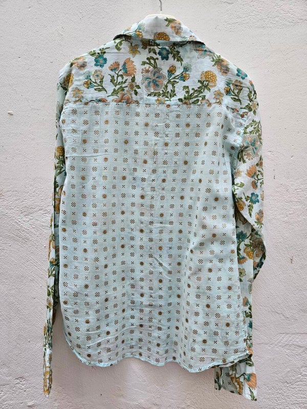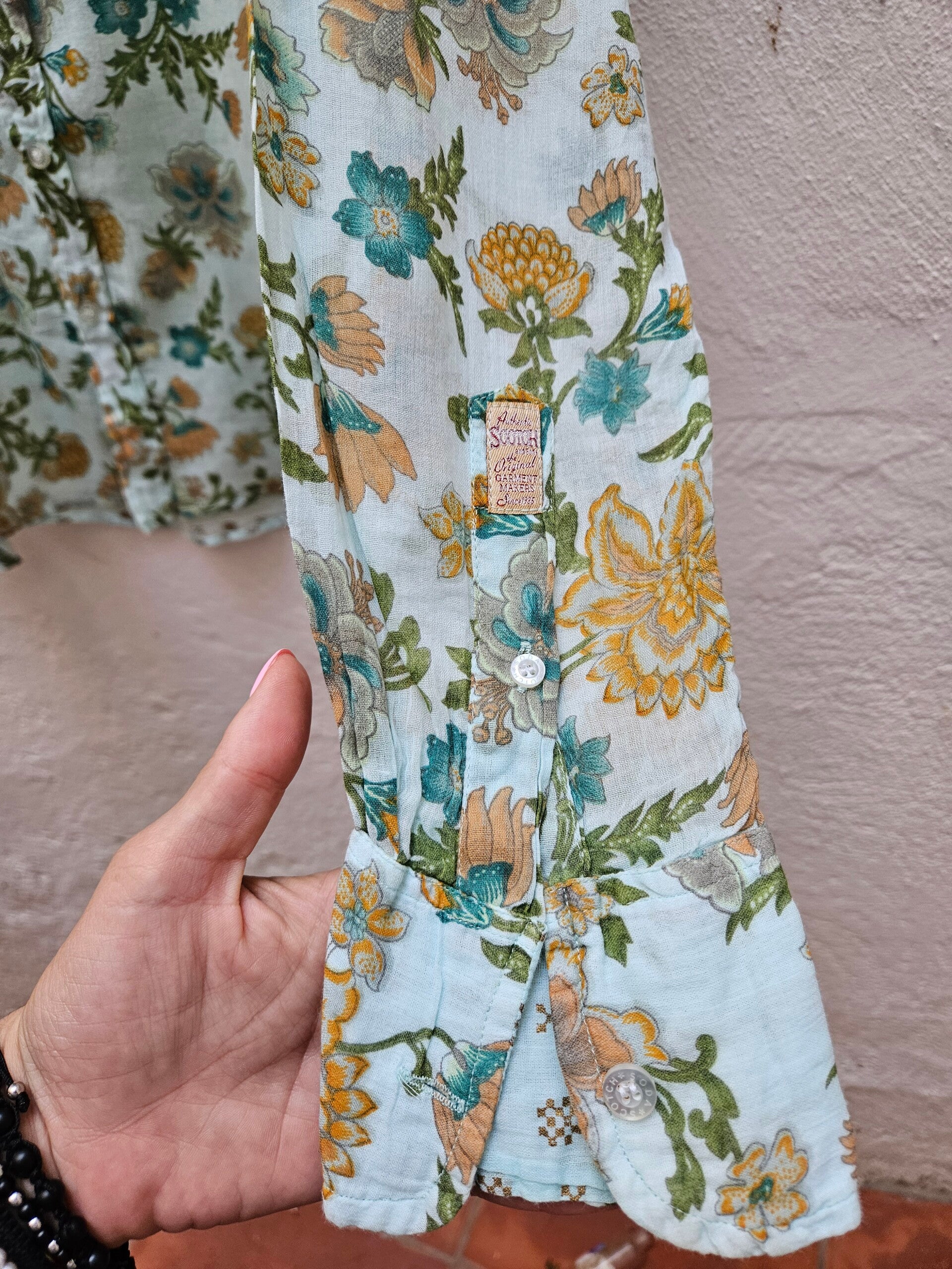 Camisa turquesa estampada como nueva. Es muy bonita. Es la talla S, de la marca Scotch. De axila a axila mide 53cm, de hombros 42cm y de largo 69cm. Composición: 100% algodón.