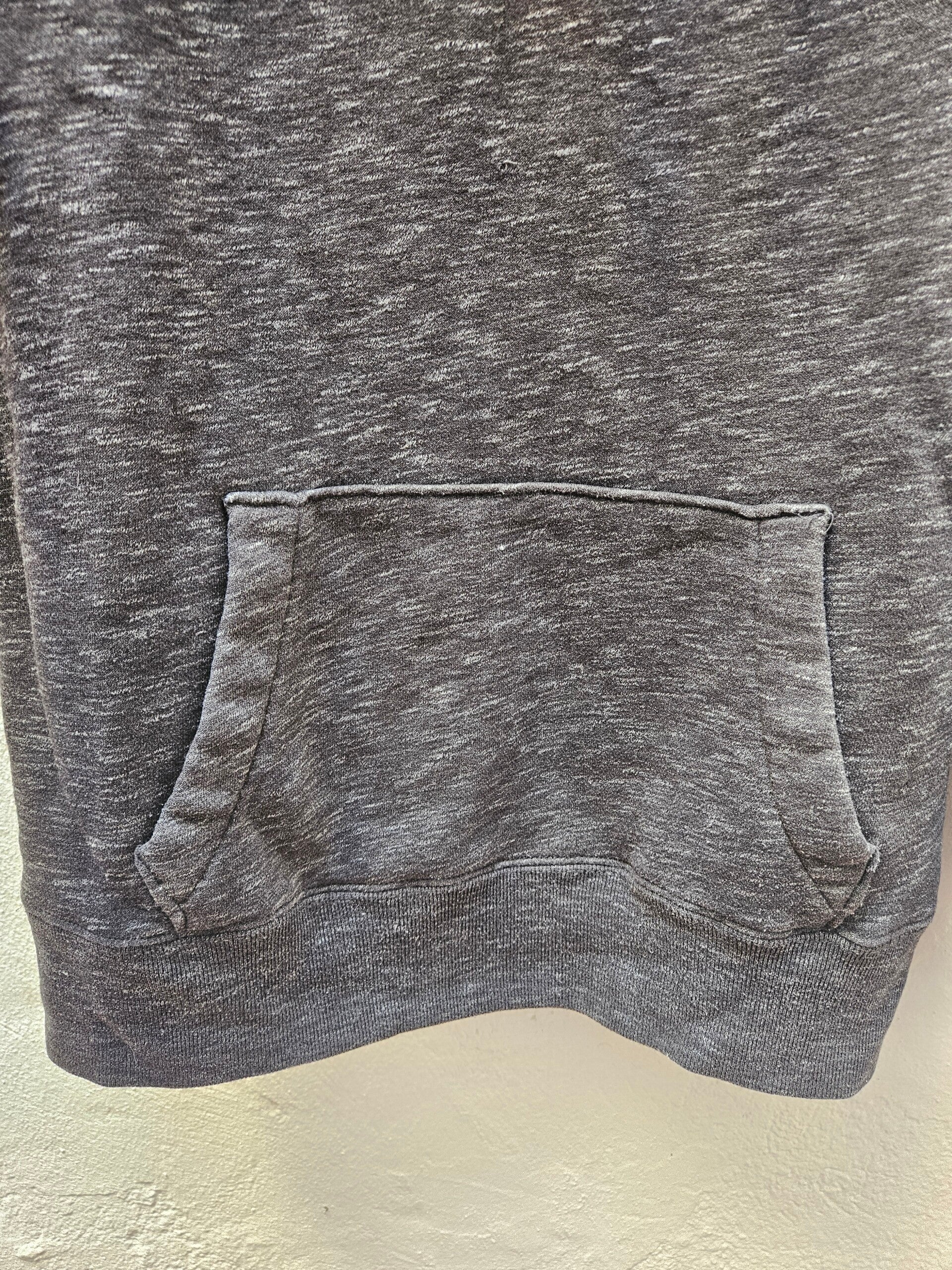 Sudadera negra y gris jaspeado con uso, pero en buen estado salvo la zona negra que presenta desgaste de los lavados. Lleva capucha y bolsillos central. Es la talla XS, de la marca Hollister. La zona negra tiene algo de desgaste (adjunto foto). De axila a axila mide 52,50cm, de hombros 41,50cm y de largo 64cm. Composición: 70% algodón y 30% poliester.