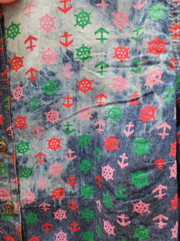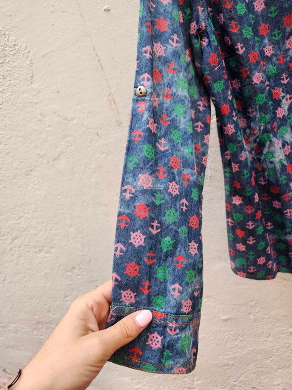 Camisa azul con dibujos de anclas y timón nueva a estrenar. Es la talla 44, de la marca Nymphaea Alba. Con etiqueta. De axila a axila mide 51cm, de hombros 40cm y de largo 65cm. Las mangas se pueden hacer cortas. Composicion: 100% algodón.
