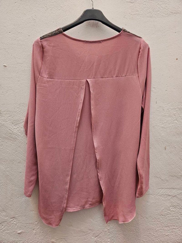 Blusa rosa palo como nueva. Queda holgada. Lleva decorativo brillante en los hombros. Por detrás es diseño abierto, pero lleva tela para que no se vea la espalda. Es la talla M, de la marca Sparring Casual. De axila a axila mide 50cm, de hombros 35cm y de largo 70cm. Composición: 95% poliester y 5% elastano.